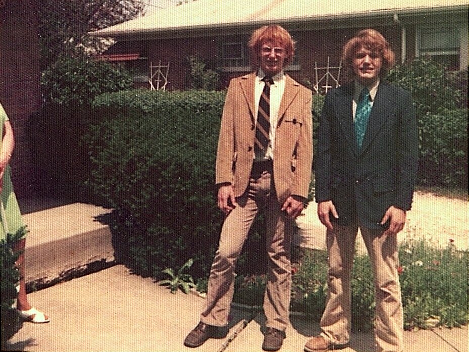 My fourth year of college I couldn’t be a resident assistant because I would be away in the spring doing my student teaching. So Jim Meyer and I roomed together for the first time. It was good. I got a job at a restaurant as a busboy, so I had the privilege of bringing home leftover soup almost every night I worked there, great for two hungry and poor college students! To the right is a photo of Jim and another friend named Mike at the edge of town.